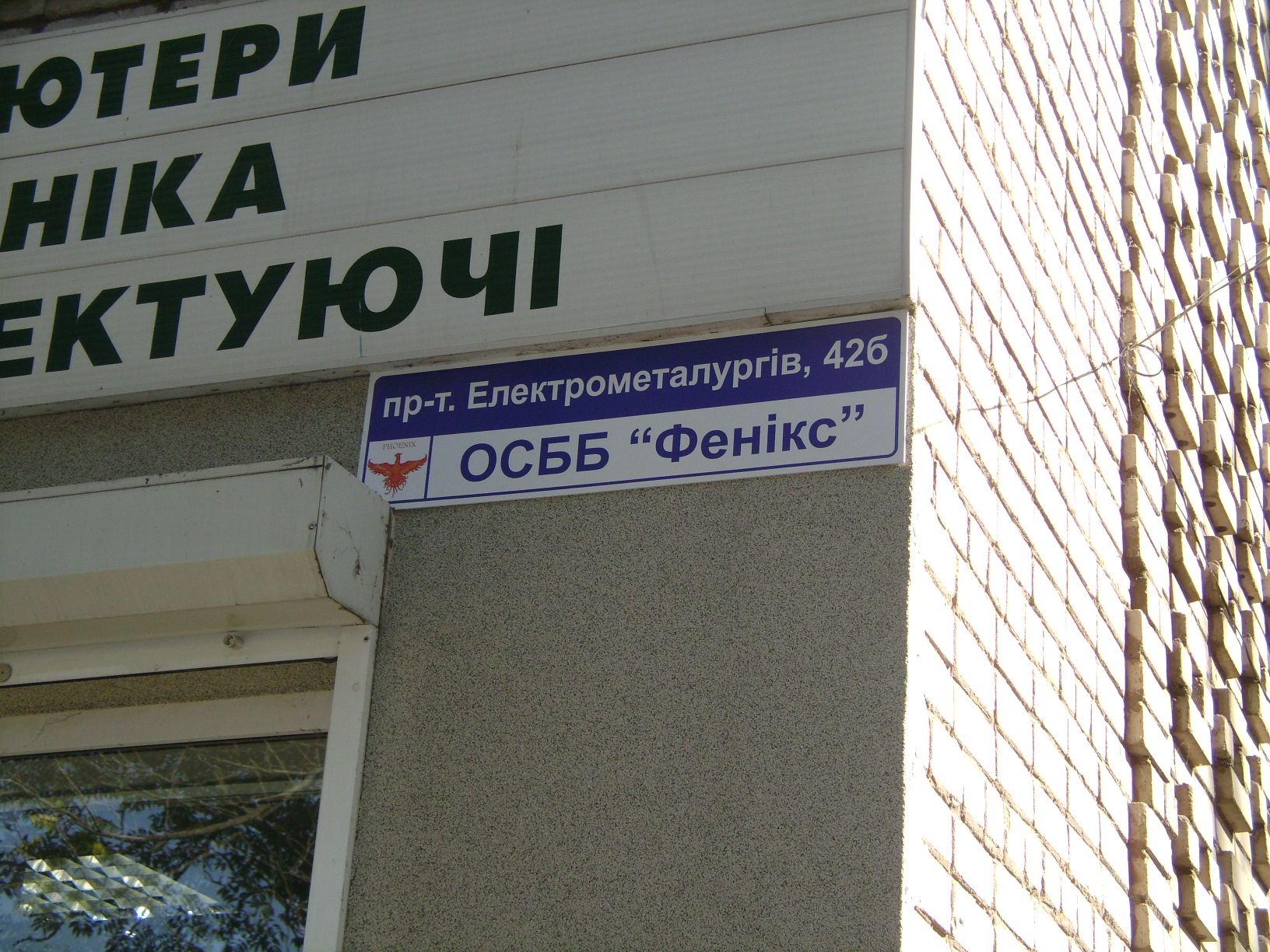 Відсьогодні наш будинок буде легше знайти мешканцям міста та різним службам. На фасаді будинку розмістилися дві яскраві таблички з адресою та назвою нашого ОСББ. Вартість виготовлення та монтажу двох таких табличок 220 грн. Виробник - фірма "Контур".